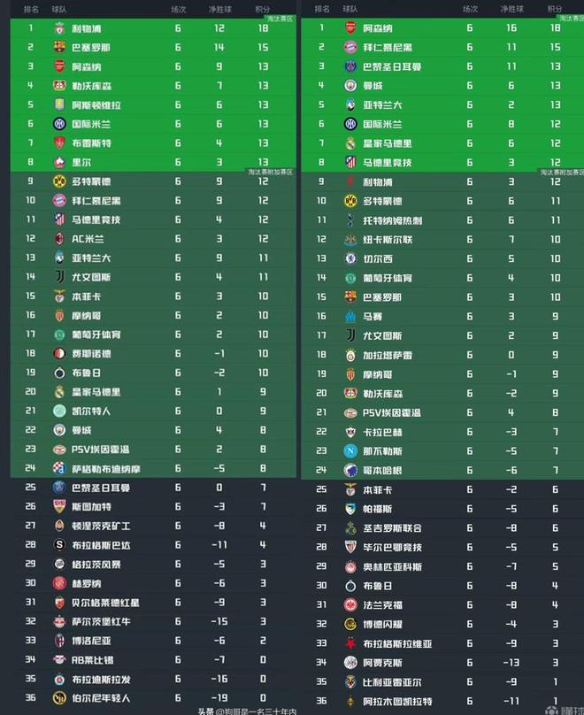 与去年相比同期欧冠战罢六轮之后的积分榜相比较,如下: